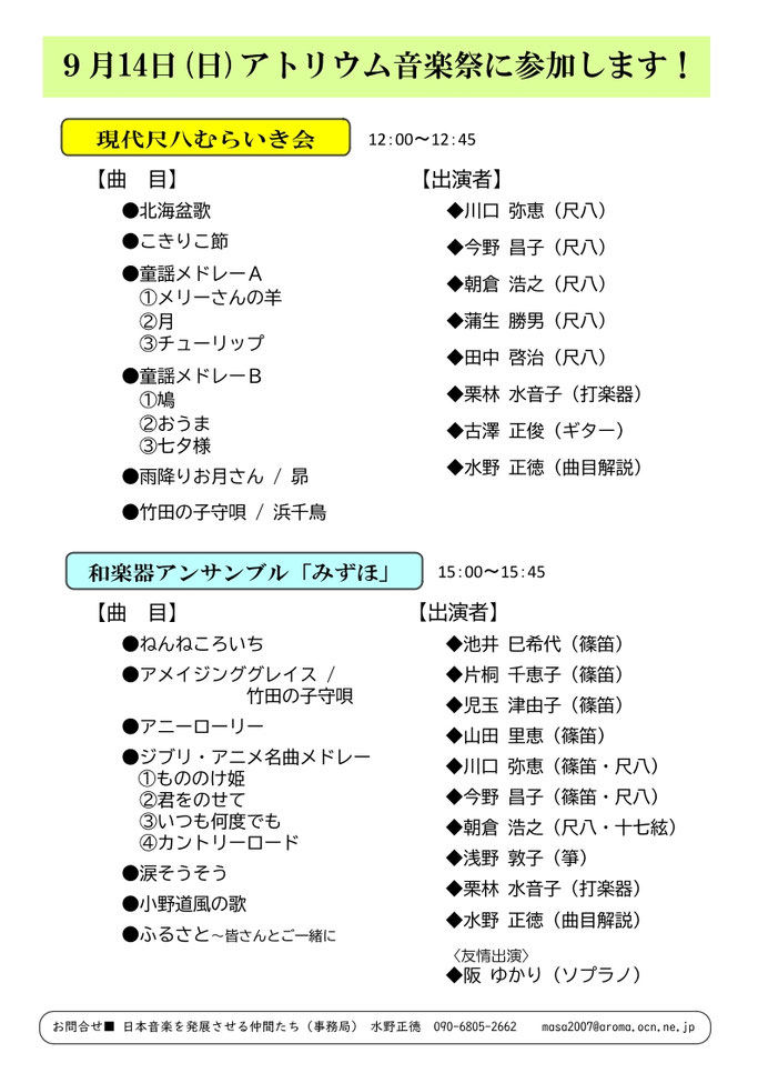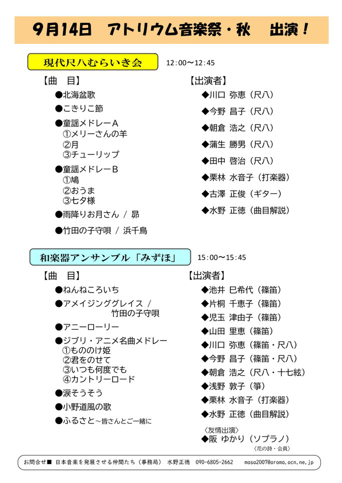 和楽器アンサンブル「みずほ」 9月10日(土)13時~